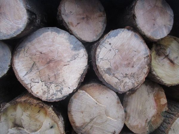 Alas the tree from which this wood came had a hollow trunk. These branches and secondary trunks were scarcely 14″ across, far too small to mill for harp parts. This is a stack of firewood.